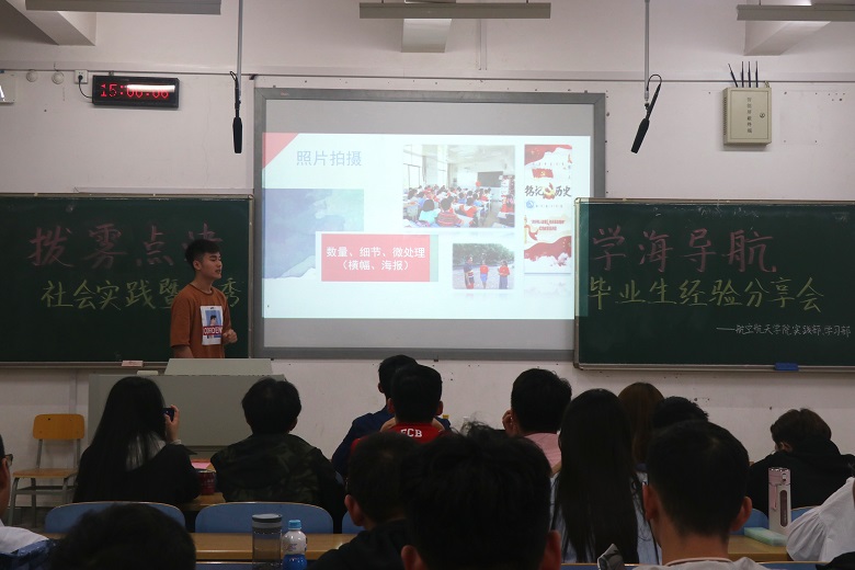 首先,由成功考研至上交的沈琦越同学为大家分享了关于考研的经验。他以自己为例,从时间、方法和坚持三个方面对同学们提出了要求,并鼓励大家严格要求自己。第二位出场的是保研到了中科院的林明月同学,她为大家分享了关于自己保研的经验。她为大家分析了不同学校的情况,提出了自己的建议,并与同学进行了交流。随后为大家分享就业经验的,是即将就职于华为的汪鹏飞同学。他从不同角度向大家介绍了找工作时的技巧,并鼓励大家根据自己的情况,勇敢做出选择。之后是在2018年暑期社会实践活动中表现优异,被评为优秀个人的徐文财同学,他为大家介绍了自己在去年暑假的社会实践活动,分享了自己的成功经验。随后,爱心同盟会的会长陈康依则为大家分享了暑期乡村支教的具体情况,并对同学们的一些问题提出了自己的看法。最后,由航工1701班的谷建宁为大家介绍了往年社会实践的具体情况,并和同学们分享了一些成功的经验和注意事项,着重解答了一些同学们重点关注的问题。