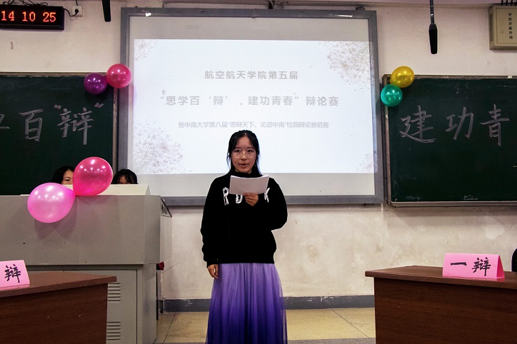 天朗气清,惠风和畅。为了提升锻炼同学们的思辨、应变能力,航空航天学院于11月25日在A座110教室举办了“思学百‘辩’,建功青春”第五届辩论赛。辅导员高佩茹老师、团委学生会主席团成员作为评委出席此次比赛,比赛由学习部干事陈姚瑶主持。