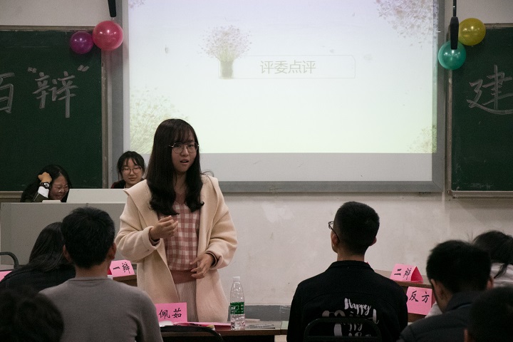 在接下来的评委总结中,辅导员高佩茹老师首先对本次辩论赛的举行表示了肯定,同时也就各位在场辩手答辩时的表现表示了鼓励与支持,从各位辩手的各自辩论风格的角度为大家指出了往后可行的发展方向与提升空间所在,并不忘对在场的所有同学的到来表示了衷心的感谢。最终,本次活动在合影后落下帷幕。