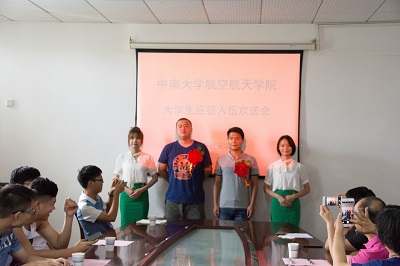9月8日,航空航天学院在校本部升华后楼六楼会议室为探测制导与控制1401班陈楚麟同学及探测制导与控制1501班的韩同欢同学举行入伍欢送会。出席欢送会的领导老师有中南大学国防教育办公室主任陈迎明,学生家长代表苏诞阳女士,院党总支书记胡亚军,院长罗世彬,党总支副书记邓栗,副院长杏建军,副院长梁步阁,辅导员连选。另有部分同学参与此次欢送会,大会由邓栗副书记主持。