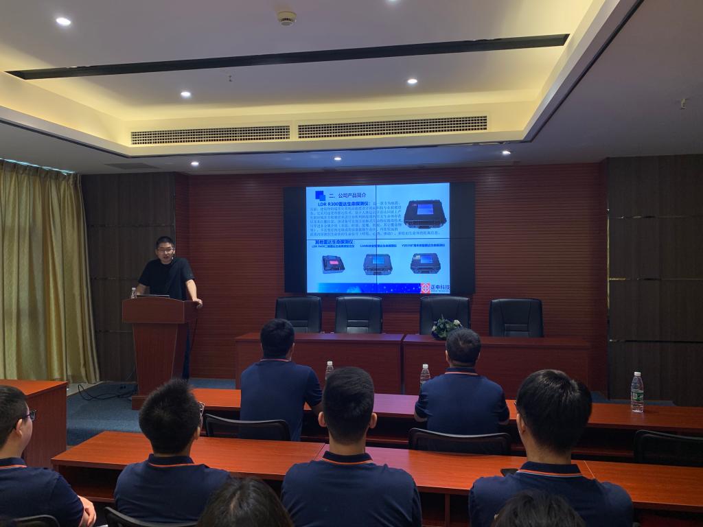 实践期间,湖南正申科技有限公司测试部经理、中南大学航空航天学院2013届优秀校友陈真提为到访的各位老师和同学介绍公司相关情况。陈经理给我们分享了公司的企业文化、发展理念,介绍了公司的人员构成和产业规模,并就业务范围和工程项目对公司的相关产品进行了简单介绍。在生产测试部的工作区,陈经理带领我们参观了雷达生产流水线,给我们展示了一款雷达产品由零碎的电子元件和雷达外壳,通过细致的安装调试,最终形成探测救援利器的主要过程。陈经理还特别邀请师生参观了公司的雷达微波暗室和外场测试平台。在微波暗室中雷达的探测性能不受外界强杂波和噪声干扰,工程师能根据探测数据对雷达样机进行测试和调试工作。