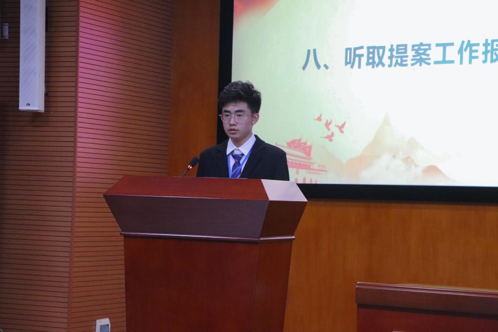 随后,航空航天学院学生代表徐辉作提案工作报告。大会共收到提案50份,涵盖学校后勤与设施改善,学校、学院制度完善,学生学习与专业培养,课外活动与学生发展等四个方面,较为客观全面地反映了同学们的意见和建议。