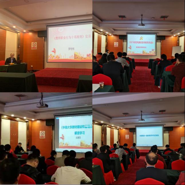 随后,胡亚军宣讲了《深入学习习近平总书记关于意识形态工作的重要论述》、《中南大学教师师德失范行为处理办法(试行)》,强调要坚定不移做好新时代意识形态工作,对师德失范行为实行一票否决,零容忍。