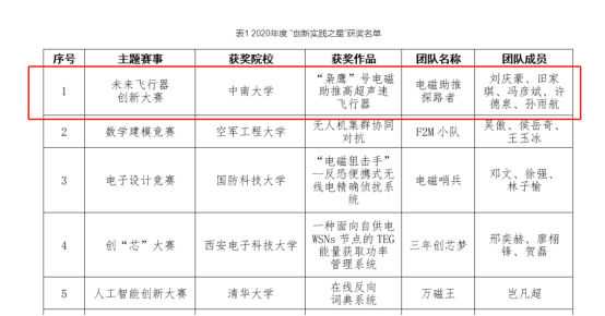 为了树立研究生科技创新实践标杆典型,激励研究生学子勇担科技报国使命,激发广大研究生科技创新活力,中国研究生创新实践系列大赛组委会研究决定,自2020年起,授予各主题赛事获得金奖或特等奖的团队“研究生创新实践之星”称号。研究生刘庆豪、田家琪、冯彦斌、许德泉、孙雨航组成的“电磁助推探路者”团队获评“研究生创新实践之星”。