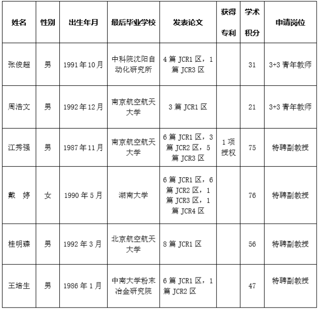 航空航天学院拟推荐张俊超等六位同志申请中南大学新进教师的公示