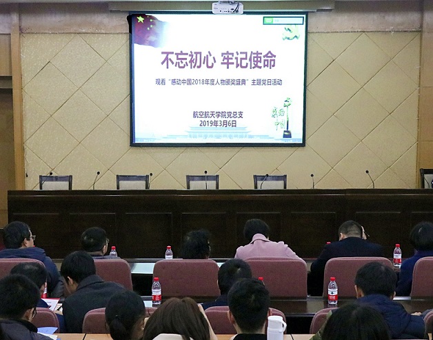 2019年3月6日下午,航空航天学院党总支组织师生党员在升华楼报告厅观看“2018年度感动中国人物颁奖盛典”,这是学院新学期开展的第一次以“不忘初心牢记使命”为主题的党日活动。